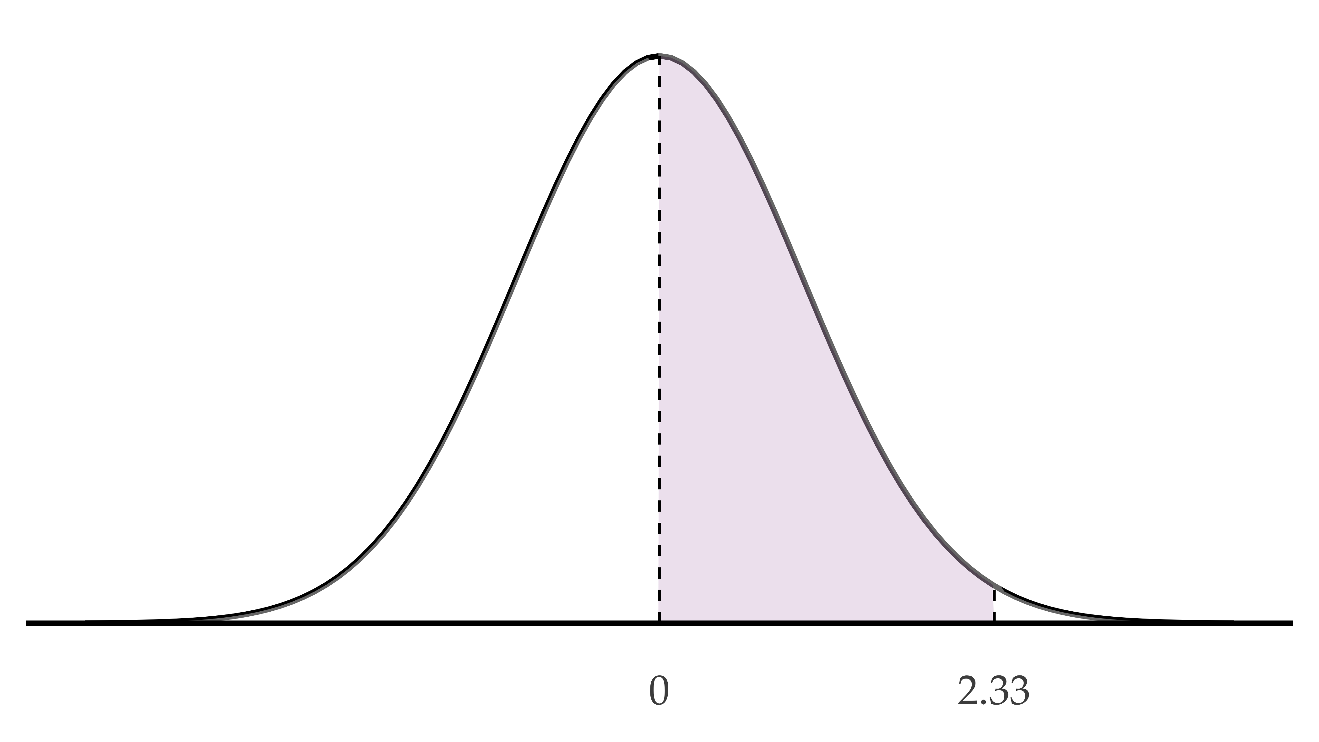 The probability that \(Z\) takes values between 0 and 2.33 is