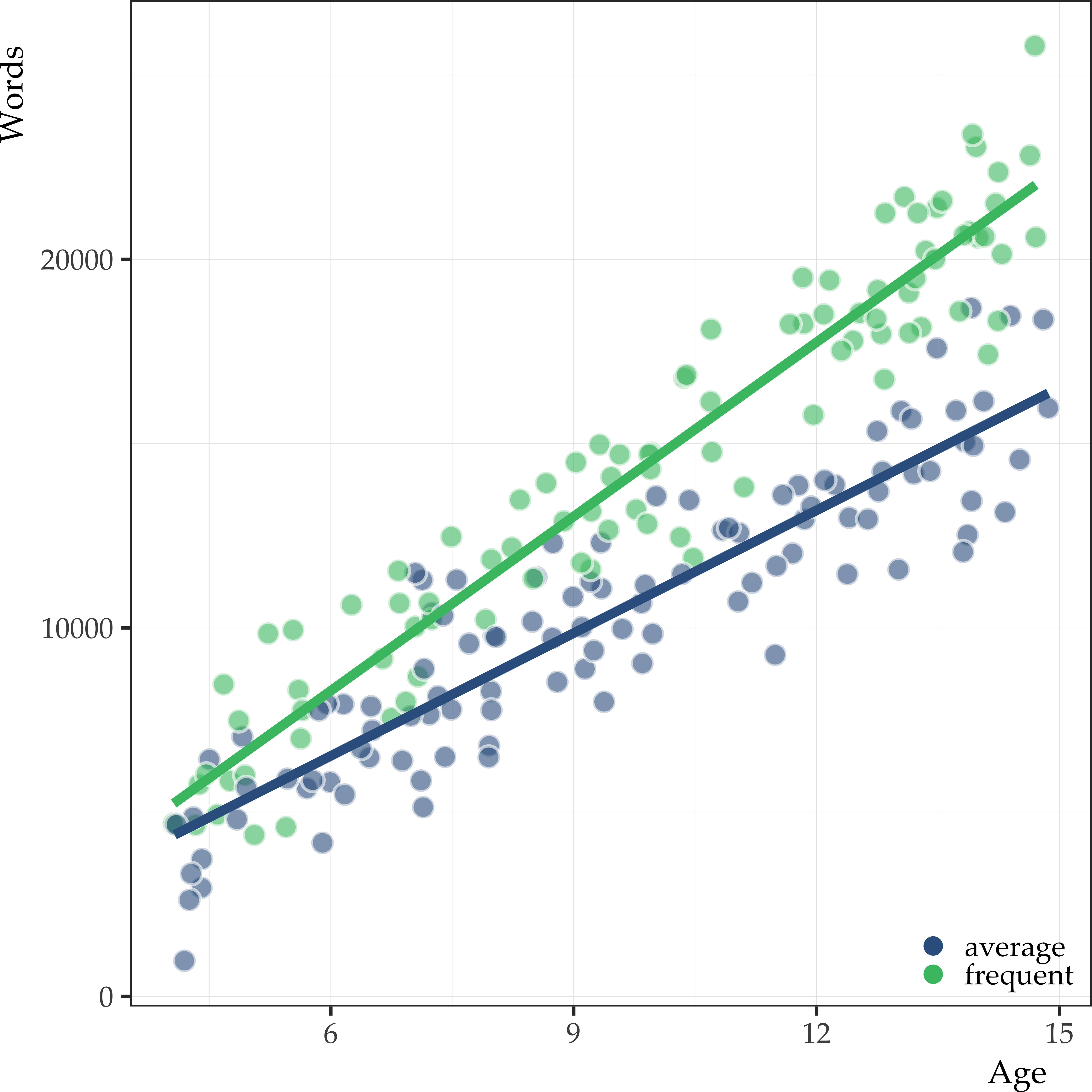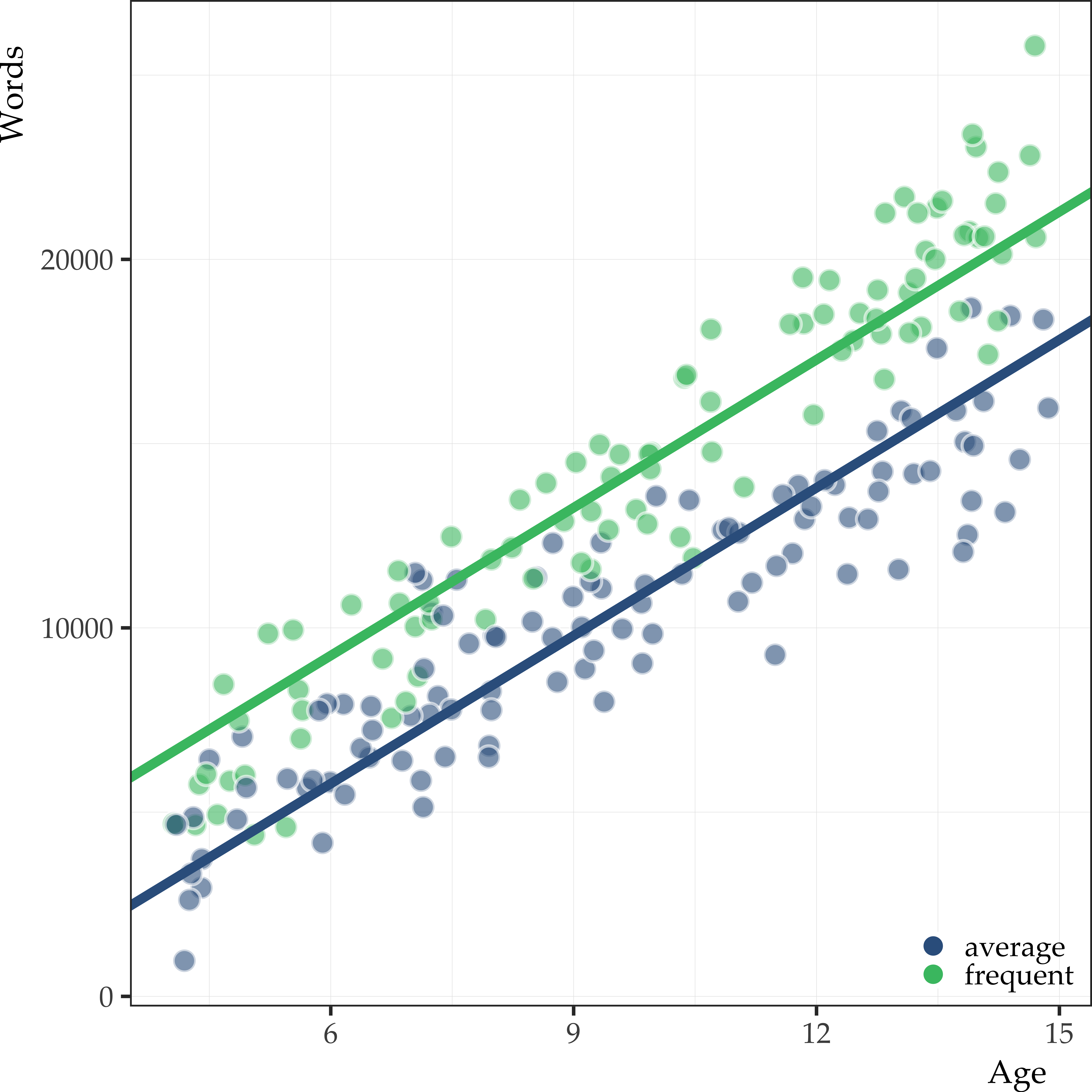 There was a main effect of age (F(1) = 1649.49, p < 0.001), reader type (F(1) = 243.34; p < 0.001), as well as an age by reader type interaction (F(1) = 45.19; p < 0.001). The model containing the interaction provided the best fit of the data (R2 = 0.91). Overall, vocabulary size increased as a function of age. However, the size of the effect was modulated by reader type. Specifically, average readers showed an increase of approximately 1,111 words +/- 48.42 se (t = 22.94, p < 0.001) per year. Frequent readers showed an additional increase of 466 words +/- 69.28 se per year (1,577 words total, t = 6.72, p < 0.001).